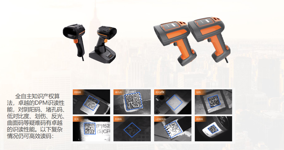 全自主知识产权算法,卓越的DPM识读性能,对阴阳码、堵孔码、低对比度、划伤、反光、曲面码等疑难码有卓越的识读性能。以下复杂情况仍可高效读码